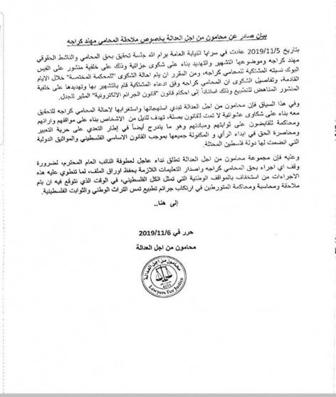 وجاء في بيان مجموعة محامون من أجل العدالة أنه:" بتاريخ 5/11/2019 عقدت في سرايا النيابة العامة برام الله جلسة تحقيق بحق المحامي والناشط الحقوقي مهند كراجه وموضوعها التشهير والتهديد بناء على شكوى جزائية وذلك على خلفية منشور على الفيس البوك نسبته المشتكية للمحامي كراجه، ومن المقرر ان يتم احالة الشكوى "للمحكمة المختصة" خلال الايام القادمة، وتفاصيل الشكوى ان المحامي كراجه وفق ادعاء المشتكية قام بالتشهير بها وتهديدها على خلفية المنشور المناهض للتطبيع وذلك استناداً إلى احكام قانون "قانون الجرائم الالكترونية" المثير للجدل".