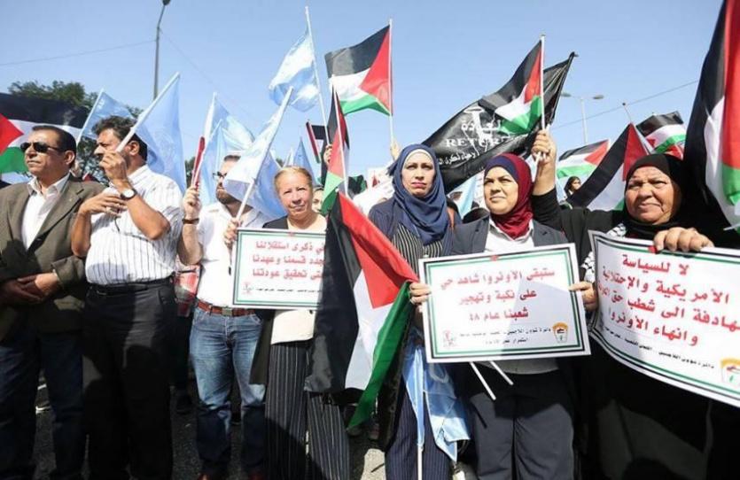 ورفع المشاركون خلال الوقفة الاحتجاجية الأعلام الفلسطينية وأعلام "أونروا" وشعارات منددة بالسياسة الأمريكية التصفوية للحقوق والثوابت الفلسطينية.