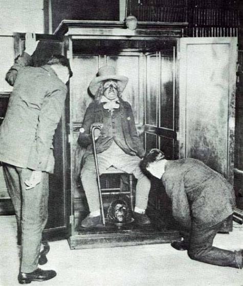 في حالة غريبة متعلقة بعالم القانون والفيلسوف الإنكليزي "جيرمي بنثام "بعد موته في عام 1832 ترك وصية طلب فيها أن يتم الإحتفاظ بجسمه عن طريق التحنيط وبالفعل تم تلبية طلبه وتم تحنيط جثته ثم وضعت في صندوق خشبي .