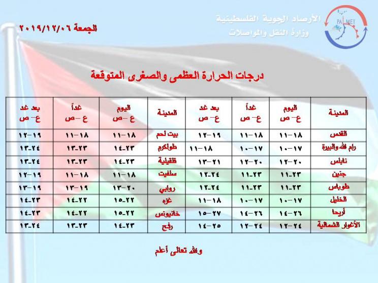 أفادت الأرصاد الجوية الفلسطينية أن الأيام القادمة أن الجو سيكونغائماً جزئياً وبارداَ خاصة في المرتفعات ألجبلية والفرصة مهيأة لسقوط امطار متفرقة فوق بعض المناطق،على النحو التالي: