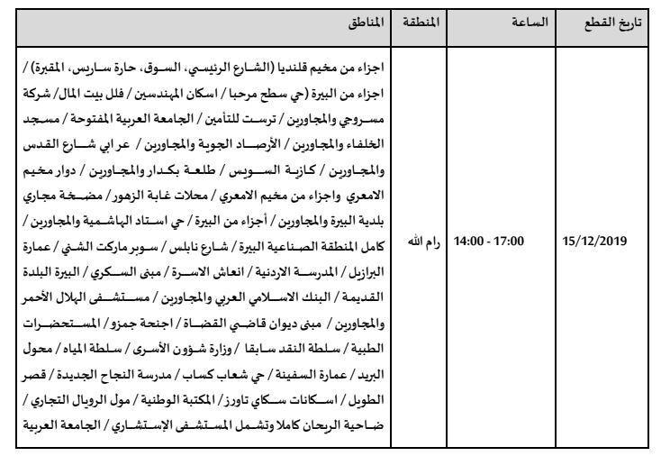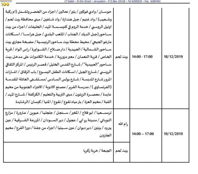 أعلنت شركة كهرباء القدس عن جدول الجولة الجديدة من قطع التيار الكهربائي والذي تسلمته الشركة يوم الأحد بتاريخ 8/12/2019 من كهرباء الاحتلال، تبعاً لجدول تقنين التيار الكهربائي عن مناطق امتياز الشركة التي بدأت في الجولة الأولى 22/9/2019 وحتى تاريخه، وهي بذلك تضرب بعرض الحائط كافة الاتفاقيات الموقعة بين الجانب الفلسطيني والإسرائيلي، وفقا لبيان كهرباءالقدس.