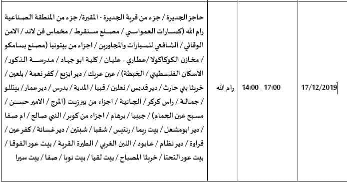 المناطق التي ستتأثر بالقطع من الجانب الاسرائيلي اليوم الثلاثاء الموافق 17/12/2019 من الساعة الثانية مساء وحتى الخامسة مساء