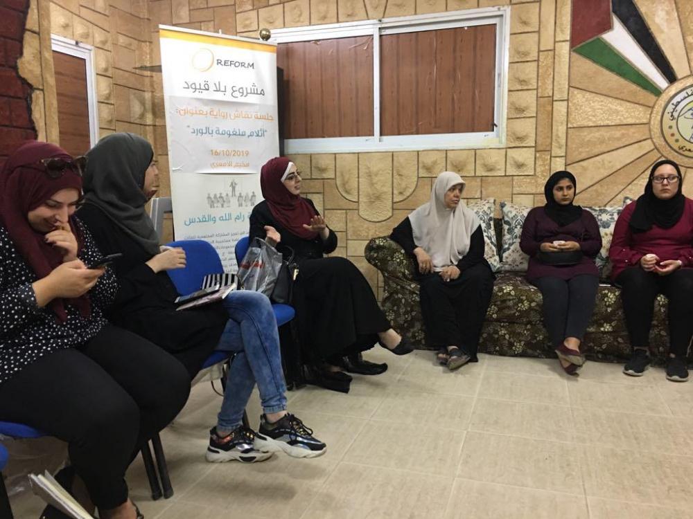 ناقشت المؤسسة الفلسطينية للتمكين والتنمية المحلية REFORM رواية أثلام ملغومة بالورد للكاتبة صابرين فرعون، وسلطت الكاتبة من خلال الرواية اثار العنف الاسري على الاسرة بشكل عام والافراد بشكل خاص ، السلطة الذكورية وممارسته على الافراد، ، اثار انتهاك وسلب الحقوق من الافراد، ودور القضاء في حماية حالات العنف، وذلك بحضور وعدد من النشطاء المجتمعين والشباب ضمن مشروع بلا قيود في نادي الطفل الفلسطيني في مخيم الامعري في مدينة رام الله .