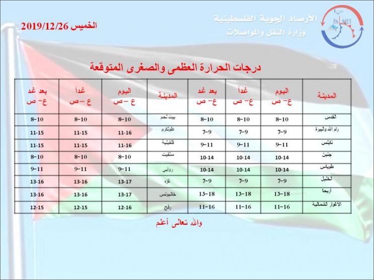 الجمعة: يكون الجو غائماً وباردا الى شديد البرودة وماطرا على فترات على مختلف المناطق والأمطار تكون غزيرة ومصحوبة بعواصف رعدية وتساقط البرد احياناً، والرياح جنوبية غربية الى غربية نشطة السرعة مع هبات قوية احيانا والبحر مائجاً .