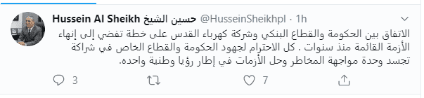 قال عضو اللجنة المركزية لحركة فتح وزير الشؤون المدنية، حسين الشيخ، اليوم السبت إنه تم الاتفاق بين الحكومة والقطاع البنكي وشركة كهرباء القدس على خطة تفضي إلى إنهاء الأزمة القائمة منذ سنوات.