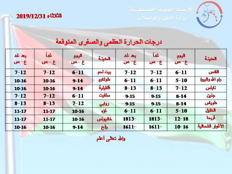 وهذه الليلة يكون الجو غائما جزئيا الى غائم وشديد البرودة، وتكون الفرصة ضعيفة لسقوط زخات متفرقة من الأمطار على بعض المناطق خاصة الشمالية، والرياح جنوبية غربية الى غربية معتدلة السرعة تنشط أحيانا، والبحر خفيف الى متوسط ارتفاع الموج .