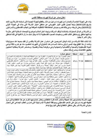 أعلنت شركة كهرباء القدس، اليوم الثلاثاء، عن برنامج قطاع التيّار الكهربائي ليومي الأربعاء والخميس، ضمن الجولة الخامسة، بناءً على إنذار شركة الكهرباء الإسرائيلية.