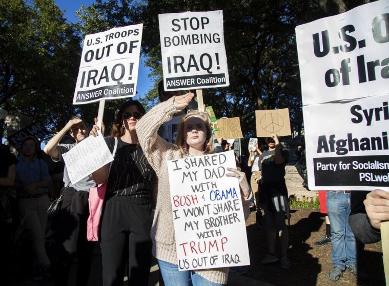 تظاهر المئات أمام البيت الأبيض في واشنطن، السبت، مطالبين الإدارة الأميركية بالانسحاب من العراق، وتجنب الحرب مع إيران. كما شهدت العاصمة البريطانية لندن، مظاهرة رافضة لإشعال أي حرب مع إيران، على خلفية اغتيال قائد "فيلق القدس" الإيراني قاسم سليماني في غارة أميركية بالعاصمة العراقية بغداد، فجر الجمعة.