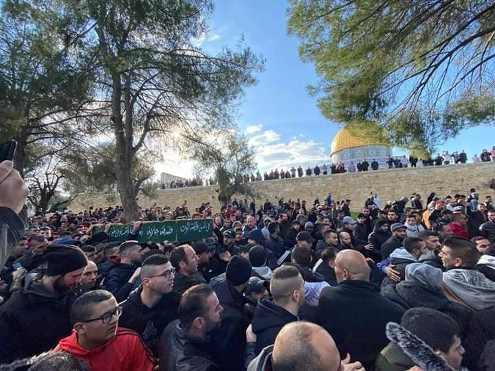 شاهد.. آلاف الفلسطينيين يشيعون جثمان الطفل أبو ارميلة في المسجد الأقصى