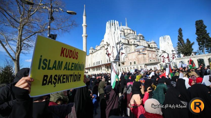 خرج اليوم الجمعة، الأتراك في مسيرات حاشدة انطلقت في العديد من الولايات التركية رفضاً لـ"صفقة القرن".