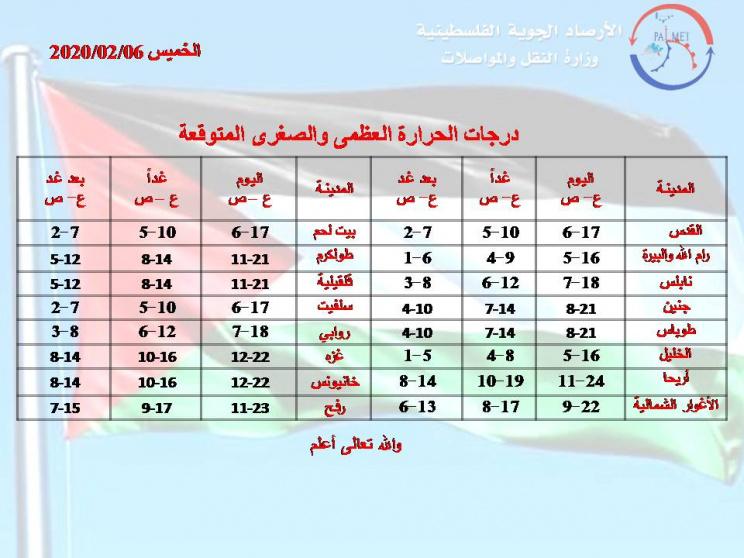 أفادت الأرصاد الجوية الفلسطينية أن الليلة يكون الجو غائماً جزئياُ الى غائم وبارداً الى شديد البرودة و تكون الفرصة مهيأة لسقوط امطار خفيفة متفرقة على فترات خاصة فوق المناطق الشمالية والوسطى ، والرياح جنوبية غربية الى غربية نشطة السرعة مع هبات قوية احيانا والبحر عالي ارتفاع الموج.