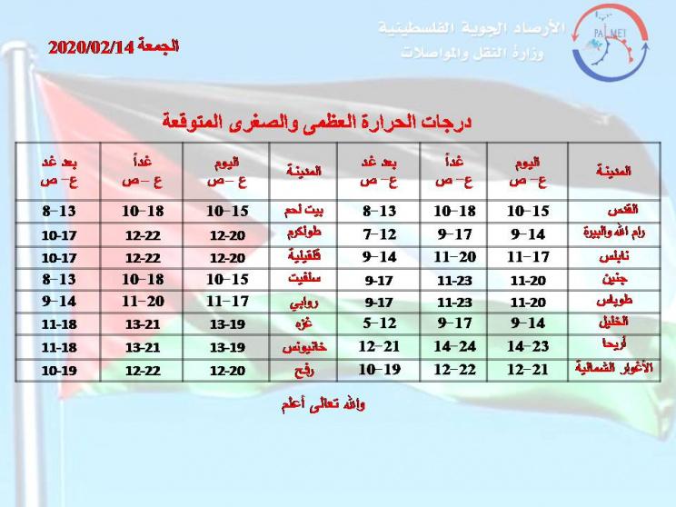 أفادت الأرصاد الجوية الفلسطينية أن الطقس الليلة يكون الجو غائماً جزئياُ الى غائم وباردا نسبياً الى بارد، والرياح جنوبية شرقية الى شرقية معتدلة الى نشطة السرعة والبحر خفيف ارتفاع الموج.