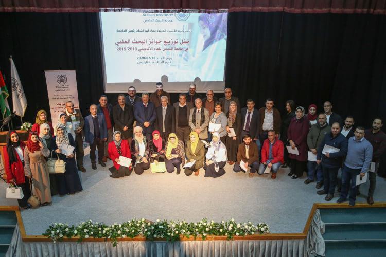احتفلت عمادة البحث العلمي في جامعة القدس بمنح جائزة البحوث الأكاديمية لأفضل الباحثين في كلياتها للعام الأكاديمي 2018-2019، تحت رعاية رئيس الجامعة أ.د. عماد أبو كشك، إذ ذهبت جائزة أفضل ورقة بحثية منشورة للكليات الإنسانية مناصفة لكل من د. نجوى الصفدي ود. صلاح الهودلية من كلية الآداب، وأفضل ورقتين بحثيتين منشورتين للكليات الطبية والحيوية والتطبيقية نالها أ.د. رفيق قرمان وأ. أنس النجار من كلية الصيدلة. كما ووزعت جوائز أنشط باحث ومجموعة بحثية في الكليات العلمية والأدبية، بالإضافة إلى تكريم الناشرين في مجلات علمية ذات تصنيف Q1&Q2، واللجان المشرفة والداعمة للبحث العلمي في الجامعة.