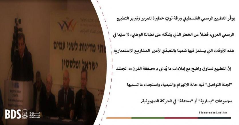 أدانت اللجنة الوطنية الفلسطينية للمقاطعة، قيادة حركة المقاطعة (BDS)، التطبيع المستمر الذي تقوم به "لجنة التواصل مع المجتمع الاسرائيلي"، المنبثقة عن منظمة التحرير الفلسطينية، وآخره مشاركة وفدٍ واسع ممثلٍ عن اللجنة التطبيعية فيما يسمى "برلمان السلام" التطبيعي في تل أبيب مع أحزاب وشخصيات صهيونية إسرائيلية لبحث صفقة القرن وتداعياتها.