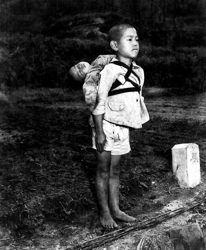 هذه الصورة تعد من أهم 100 صورة في التاريخ، صبي ياباني ينتظر دوره في محرقة الجثت حاملاً شقيقه المتوفّى على ظهره في سبتمبر 1945 في جزيرة "ناكازاكي" التي دكتها الطائرات الأمريكية بالقنابل الذرية والعنقودية لتحولها إلى ركام.