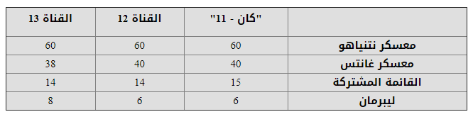 وجاءت نتائج استطلاعات الرأي في القنوات الإسرائيلية على النحو التالي: