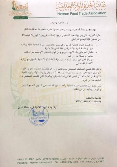 قالت نقابة تجار المواد الغذائية في محافظة الخليل في بيان صدر عنها في ظل أزمة انتشار فايروس كورونا إن كميات المواد الغذائية الموجودة في المستودعات وخاصة المواد الأساسية كافية لكافة المدن وبكميات كبيرة، مطمئنة المواطنين بأنه لا يوجد أي نوع من أنواع الاحتكار لأي سلعة كانت، وداعية إلى عدم الانجرار وراء الشائعات المتداولة عبر وسائل التواصل الاجتماعي.