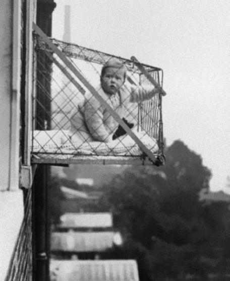 التقطت الصورة عام 1937 في ولاية كالفورنيا الأمريكية لقفص طفل يستخدم لكي يحصل على ما يكفي من أشعة الشمس والهواء النقي عندما يعيش في مبنى سكني