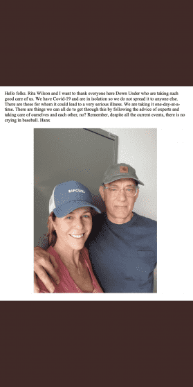 وقال النجم الأميركي، الذي كان في أستراليا تحضيرا لتصوير فيلم: "أصبنا بفيروس كوفيد-19 ونحن في الحجر، لذا لن ننقله إلى أي شخص آخر". وأشار هانكس إلى أن الفيروس "قد يتحول عند البعض إلى مرض خطير جدا"، مرفقا رسالته بصورة له ولزوجته وقد بدا عليها الارتياح.