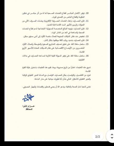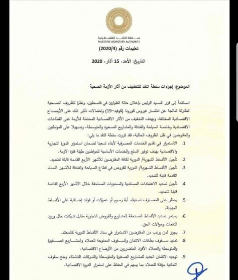 أعلن محافظ سلطة النقد الفلسطينية عزام الشوا جملة من التعليمات والإجراءات للمصارف بشأن الأوضاع الصحية الطارئة، وذلك استناداً إلى قرار السيد الرئيس بإعلان حالة الطوارئ في فلسطين، ونظراً للظروف الصحية الطارئة الناتجة عن انتشار فيروس كورونا (كوفيد-19) واحتمالات تأثير ذلك على الأوضاع الاقتصادية المختلفة.