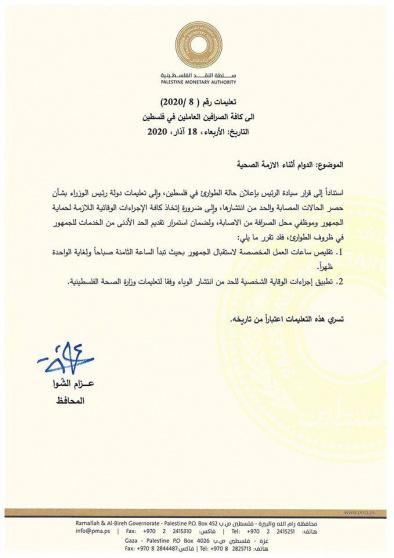 أعلنت سلطة النقد الفلسطينية، اليوم الأربعاء، عن تعليمات خاصة بدوام المصارف ومؤسسات الإقراض في فلسطين وذلك في ظل تفشي فيروس (كورونا).