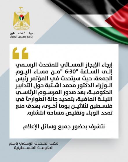 اعلن المتحدث باسم الحكومة ابراهيم ملحم، ان رئيس الوزراء محمد اشتية، سيعقد مساء اليوم في تمام الساعة 6:30 مؤتمرا صحفيا حول التدابير الحكومة بعد صدور المرسوم الرئاسي الليلة الماضية بتمديد حالة الطوارئ لثلاثين يوما اخرى بهدف منع تمدد فيروس كورونا وتقليص مساحة انتشاره.