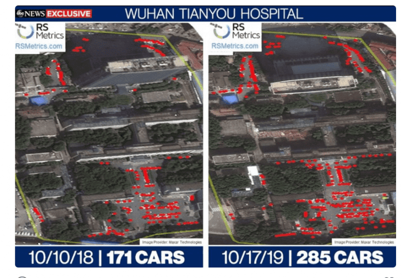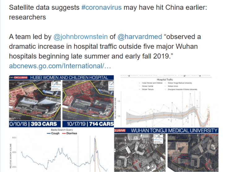 أظهر بحث أجرته كلية الطب بجامعة هارفارد أن فيروس كورونا ربما كان ينتشر في الصين في آب من العام الماضي على أبعد تقدير وذلك استنادا إلى صور بالأقمار الصناعية لأنماط حركة الدخول والخروج من المستشفيات وبيانات محركات البحث إلا أن الصين وصفت التقرير بالسخيف.