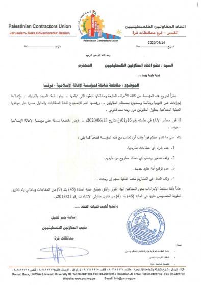 أعلن اتحاد المقاولين الفلسطينيين بمحافظات غزة، المقاطعة الشاملة لمؤسسة الاغاثة الاسلامية- فرنسا، نظرا لخروج هذه المؤسسة عن كافة الأعراف المتبعة ومخالفتها للعقود التي توقعها، وبنود العقد الموحد والفيديك.