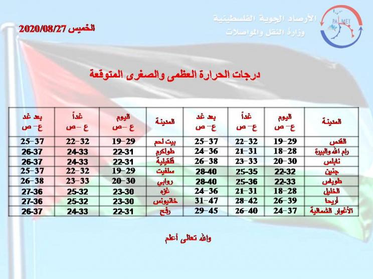 الخميس 2020/08/27: يكون الجو غائماً جزئياً إلى صاف ومعتدلاً في المناطق الجبلية حاراً نسبياً إلى حار في بقية المناطق، ويطرأ انخفاض طفيف آخر على درجات الحرارة لتصبح حول معدلها السنوي العام ، والرياح غربية إلى شمالية غربية خفيفة إلى معتدلة السرعة تنشط أحيانا والبحر خفيف ارتفاع الموج .