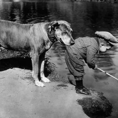 كلب يمسك طفل من الخلف خشية وقوعه في الماء في دليل واضح وصريح على وفاء الكلب وخوفه على حياة الطفل.