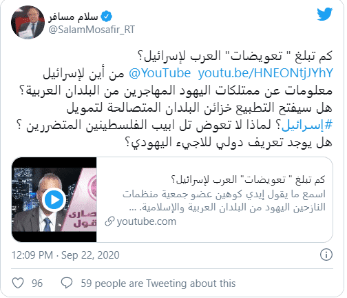 وأثارت تصريحات كوهين موجة من الجدل على مواقع التواصل، حيث تساءل سلام مسافر على حسابه في موقع تويتر: “من أين لإسرائيل معلومات عن ممتلكات اليهود المهاجرين من البلدان العربية؟ هل سيفتح التطبيع خزائن البلدان المتصالحة لتمويل #إسرائيل؟ لماذا لا تعوض تل أبيب الفلسطينيين المتضررين؟ هل يوجد تعريف دولي للاجئ اليهودي؟”.