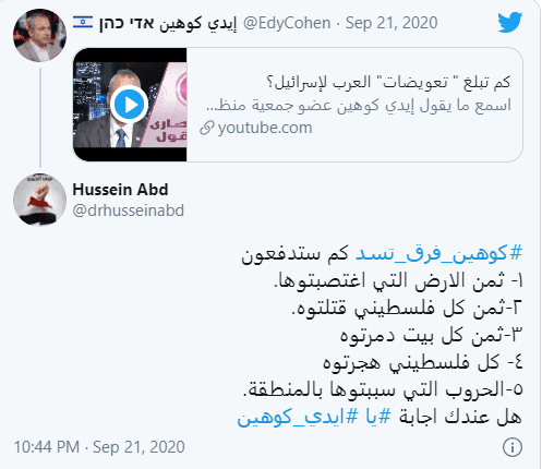 وخاطب ناشط مصري يُدعى حسين، كوهين بقوله: “كم ستدفعون ثمن الأرض التي اغتصبتوها، وثمن كل فلسطيني قتلتوه وهجرتوه، وثمن كل بيت دمرتوه، والحروب التي سببتوها في المنطقة؟”.