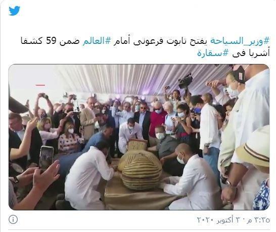 فتح خالد العناني وزير السياحة والآثار المصري إحدى التوابيت الفرعونية التي تم اكتشافها في منطقة سقارة الأثرية أمام جمع من السفراء والإعلاميين.