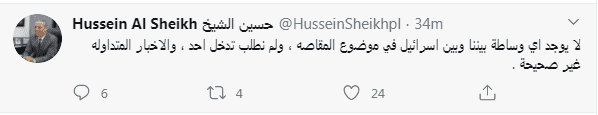 وقال الشيخ في تغريدة له على صفحته على "تويتر" إنه لا يوجد اي وساطة بين السلطة واسرائيل في موضوع المقاصه.
