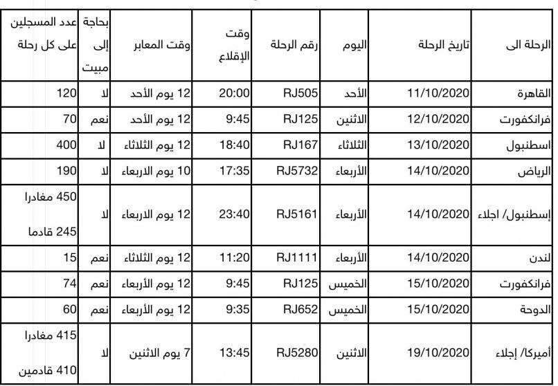 وأوضحت أنه تم الانتهاء من حصر جميع اعداد الطلبة والمواطنين الراغبين في السفر على متن تلك الرحلات كما هو موضح في الجدول أعلاه، وذلك من خلال منصة التسجيل الالكتروني على الصفحة الالكترونية لوزارة الخارجية لغالبية هذه الرحلات.
