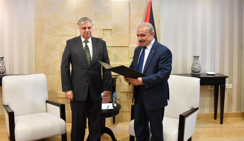 قلّد رئيس الوزراء محمد اشتية، نيابة عن الرئيس محمود عباس، رئيس مكتب تمثيل جمهورية الأرجنتين إدواردو دي مايو، "نجمة القدس" من وسام القدس.