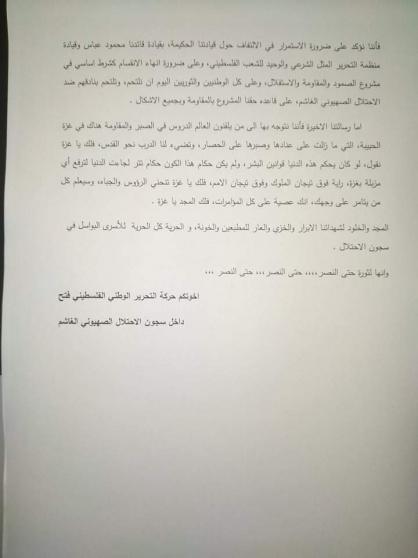 وجهت حركة فتح داخل سجون الاحتلال رسالة الى ابناء شعبنا اكدت فيها وقوفها ضد المؤامرات التي تحاك ضد القضية الفلسطينية.