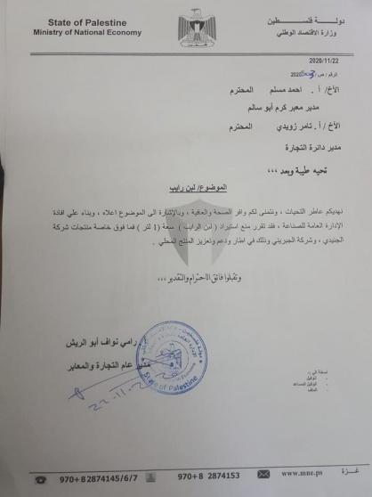 أفادت مخاطبات رسمية حصلت عليها "راية" صادرة عن وزارة الاقتصاد بغزة بمنع منتج "لبن رايب" سعة لتر وما فوق من دخول قطاع غزة.