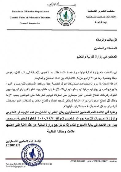 أعلن الاتحاد العام للمعلمين الفلسطينيين، الأربعاء، الإضراب الشامل مع عدم التوجه إلى المدارس والوزارات ومديريات التربية يوم غد الخميس، احتجاجاً على عدم صرف كامل المستحقات المتأخرة للموظفين.