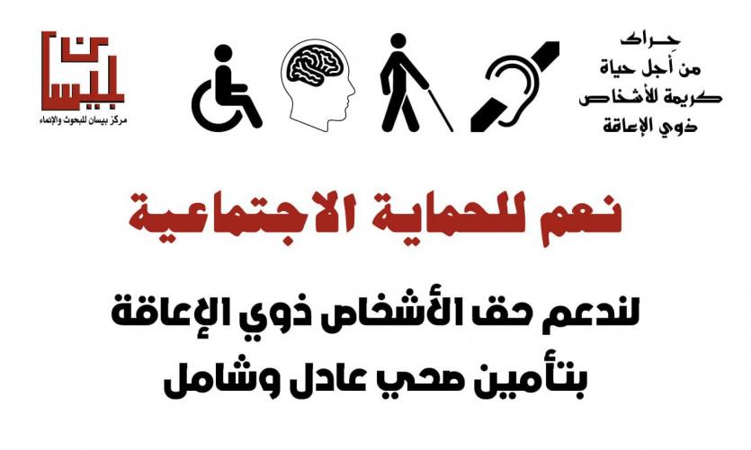 وعلى صعيد متصل، وضح عبد الرازق غزال منسق وحدة السياسات والمناصرة في مؤسسة لجان العمل الصحي أنّ التأمين الصحي القائم فشل في تحقيق مبدأ العدالة، والعدالة هنا ترتكز على جانبين: ضمان التغطية الصحية الشاملة والوصول إليها دون أعباء مالية، مع ضمان تأهيل وعلاج ذوي الإعاقة، بالإضافة للمحددات الاجتماعية للصحة والتي تحدد الصحة والسلامة، بما فيها السكن والدخل والعمل والتي لا يعمل التأمين الصحي الحالي على توفيرها تحديداً لذوي الإعاقة.