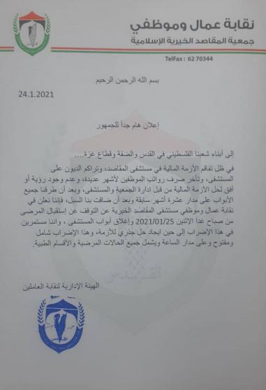 أعلنت نقابة عمال وموظفي مستشفى المقاصد اليوم الأحد، التوقف عن استقبال المرضى وإغلاق أبواب المستشفى ابتداءً من صباح غد الاثنين بسبب تفاقم الأزمة المالية في المستشفى.