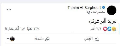 نعى الشاعر الفلسطيني الشهير تميم البرغوثي، مساء اليوم الأحد، والده مريد البرغوثي بصورة سوداء مع كتابة اسمه "مريد البرغوثي"، على موقع فيسبوك.