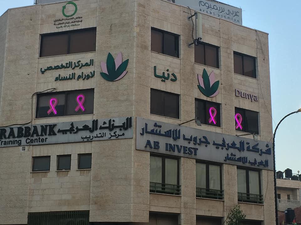 وبما أن دنيا جزء من مؤسسة لجان العمل الصحي كقطاع أهلي غير ربحي كان لا بد من التوجه للقطاع الخاص الفلسطيني ليساهم في بقاء واستمرار خدمات المركز ضمن مسؤولياته الوطنية والاجتماعية، وتطور هذا الفهم على مدى السنوات المتوالية مع نمو الفكرة وتوسعها فكانت المصارف على رأس الداعمين وعلى رأسها بنك فلسطين الشريك الإستراتيجي لدنيا في حملة أكتوبر من خلال دعم حملات التوعية عبر اللافتات الميدانية وشاشات البنك المختلفة وطواقمه العاملة ودعم بعض الحالات الاجتماعية وكان البنك صاحب المبادرة في إطلاق العيادة الوردية المتنقلة بعد تنظيم حفل موسيقي خاص قاده الثلاثي جبران إلى جانب داعمين آخرين وانطلقت العيادة الوردية بعد جمع الأموال اللازمة في محافظات القدس ورام الله والبيرة لمدة عام ونصف قبل أن تنطلق نحو محافظة نابلس إلى القرى والمخيمات هناك واستطاع طاقمها تشخيص 30 إصابة بسرطان الثدي في هذه المحافظات لنساء ما كن ليقمن بإجراءات الفحص والتقصي لولا وصول العيادة إلى تجمعات سكنهن عدا عن مئات ورش التوعية الفردية والجماعية في هذه المناطق وهو ما أسهم في كسر حواجز الخوف والخجل. وقد تم خلال هذه الفترة عمل فحص الأشعة الماموغرام ل3871 امرأة إضافةً إلى256 محاضرة حضرتها 4239 إمرأة. هذا وتعد مؤسسة العون الطبي للفلسطينيينMAP UK من الشركاء الرئيسيين والدائمين لدنيا.