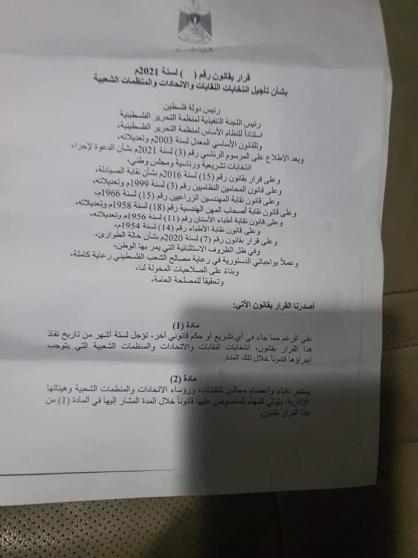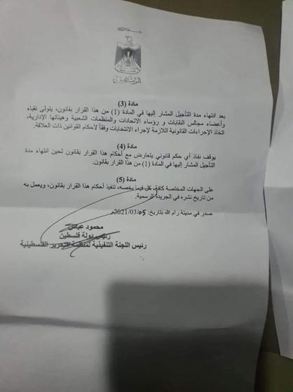 أصدر الرئيس محمود عباس، اليوم السبت، مرسوما رئاسيا بتأجيل انتخابات النقابات والاتحادات والمنظمات الشعبية، التي يتوجب إجراؤها في هذه الفترة، لمدة 6 شهور.
