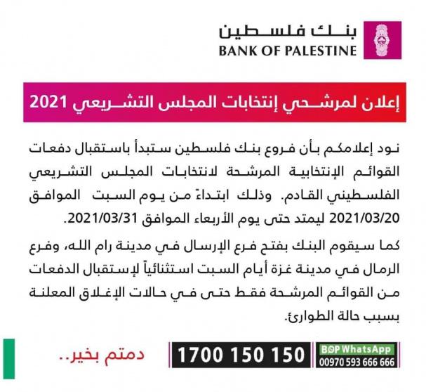 أعلن بنك فلسطين مساء الخميس، أن فروع البنك ستبدأ باستقبال دفعات القوائم الانتخابية المرشحة لانتخابات المجلس التشريعي الفلسطيني القادم. وذلك ابتداءً من يوم السبت الموافق 20/03/2021 ليمتد حتى الأربعاء الموافق 31/03/2021.