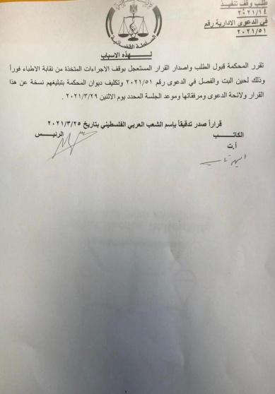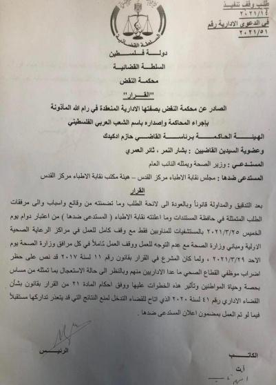 وجاء القرار بعد دعوى تقدمت بها وزارة الصحة والنائب العام، ضد نقابة الاطباء التي اعلنت عن تعليق العمل بشكل كامل يوم الاحد المقبل، حيث تبلغت النقابة بالقرار.