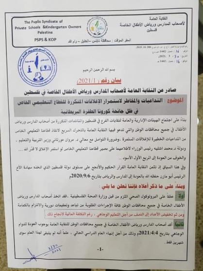 أصدرت النقابة العامة لأصحاب المدارس ورياض الأطفال الخاصة في فلسطين مساء الثلاثاء، بيانا صحفيا حول التداعيات والمخاطر لاستمرار الإغلاقات المتكررة للقطاع التعليمي الخاص في ظل جائحة كورونا "الطفرة البريطانية".