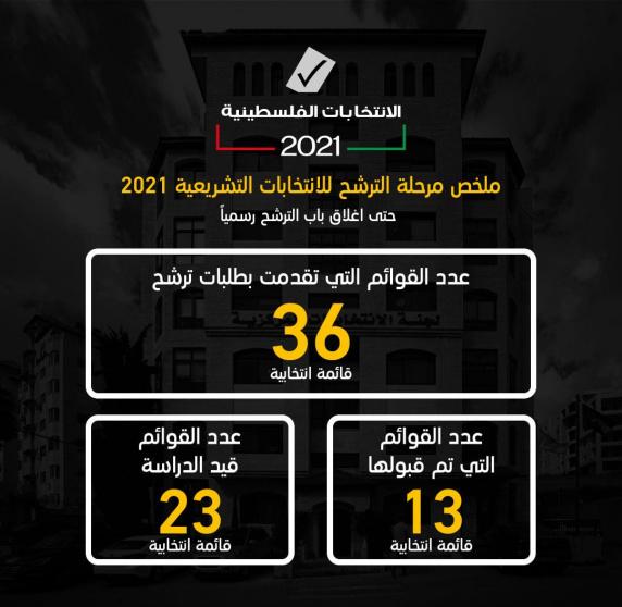 أعلنت لجنة الانتخابات المركزية، الليلة، انتهاء فترة الترشح لانتخابات المجلس التشريعي، والتي استمرت من صباح يوم 20 وحتى مساء يوم 31 آذار.