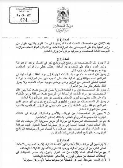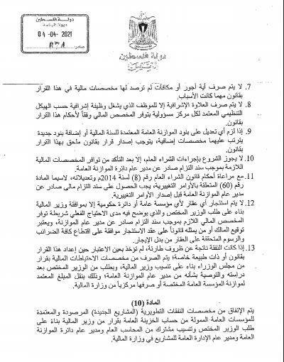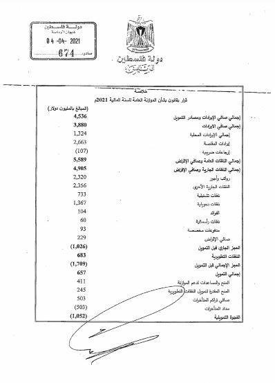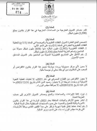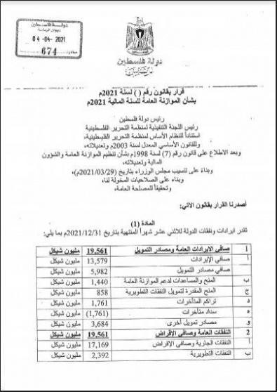 أصدرت وزارة المالية الفلسطينية، مساء اليوم الأربعاء 7 إبريل / نيسان، قرارًا بقانون بشأن الموازنة العامة للسنة المالية 2021.