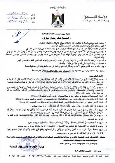 أصدرت وزارة الأوقاف والشؤون الدينية الفلسطينية، اليوم الخميس، تعميمًا بشأن إقامة خطبة وصلاة الجمعة 9/4/2021م في الساحات العامة وتعليقها في المناطق المغلقة، مشيرة إلى أنها ستكون بعنوان (استقبال شهر رمضان المبارك).